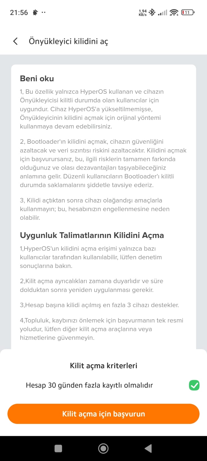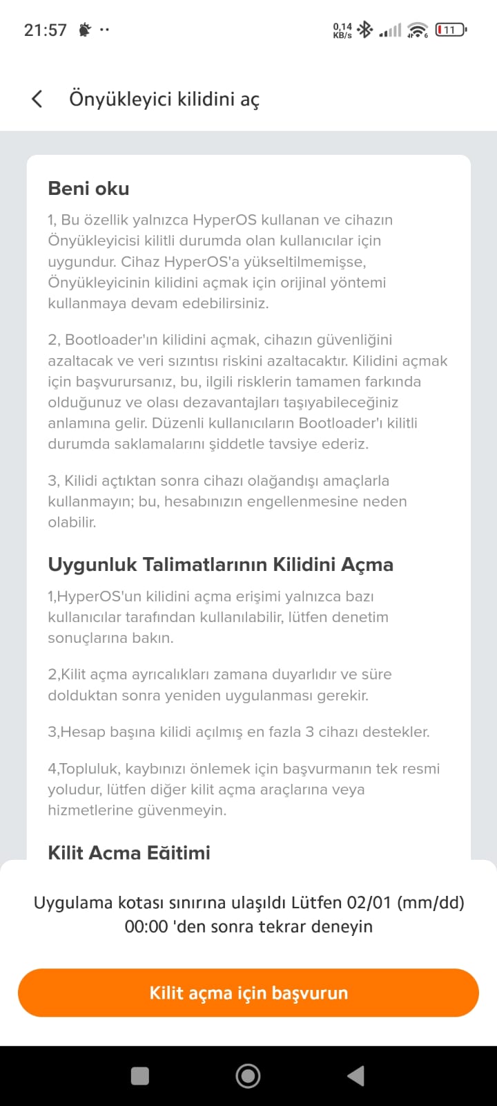 - Bu özellik yalnızca HyperOS kullanan ve cihazının önyükleyicisi kilitli durumda olan kullanıcılar için uygundur. Cihazınız HyperOS’a yükseltilmemişse, önyükleyicinin kilidini açmak için orijinal yöntemi kullanmaya devam edebilirsiniz.